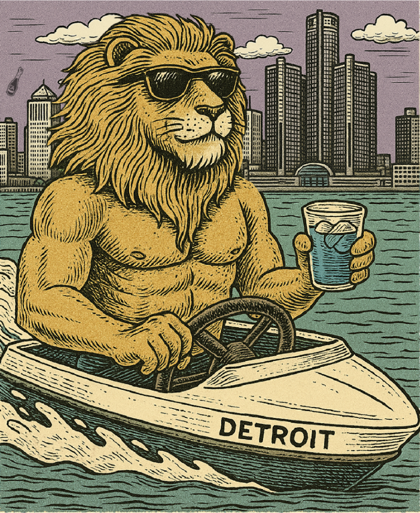 Detroit’s king of summer has arrived—mane flowing, drink in paw, and pure grit in his soul.
