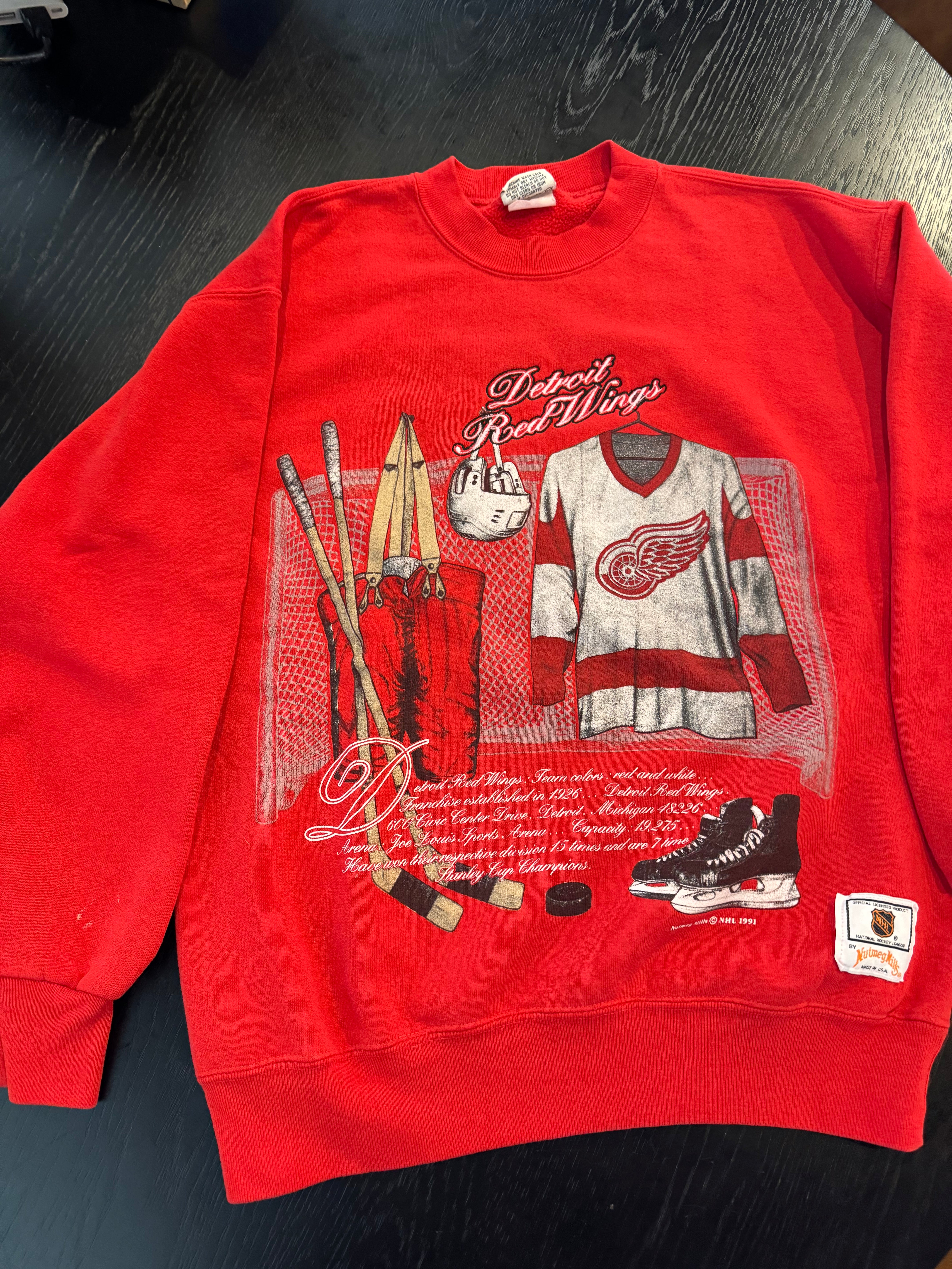 This 1991 vintage Detroit Red Wings crewneck is a wearable piece of hockey history. Featuring a full-color print of classic Red Wings equipment, jersey, and a scripted team origin story, this sweatshirt brings the nostalgia hard. An original from the NHL’s licensed collection, it’s perfect for collectors and fans of old-school Hockeytown style.