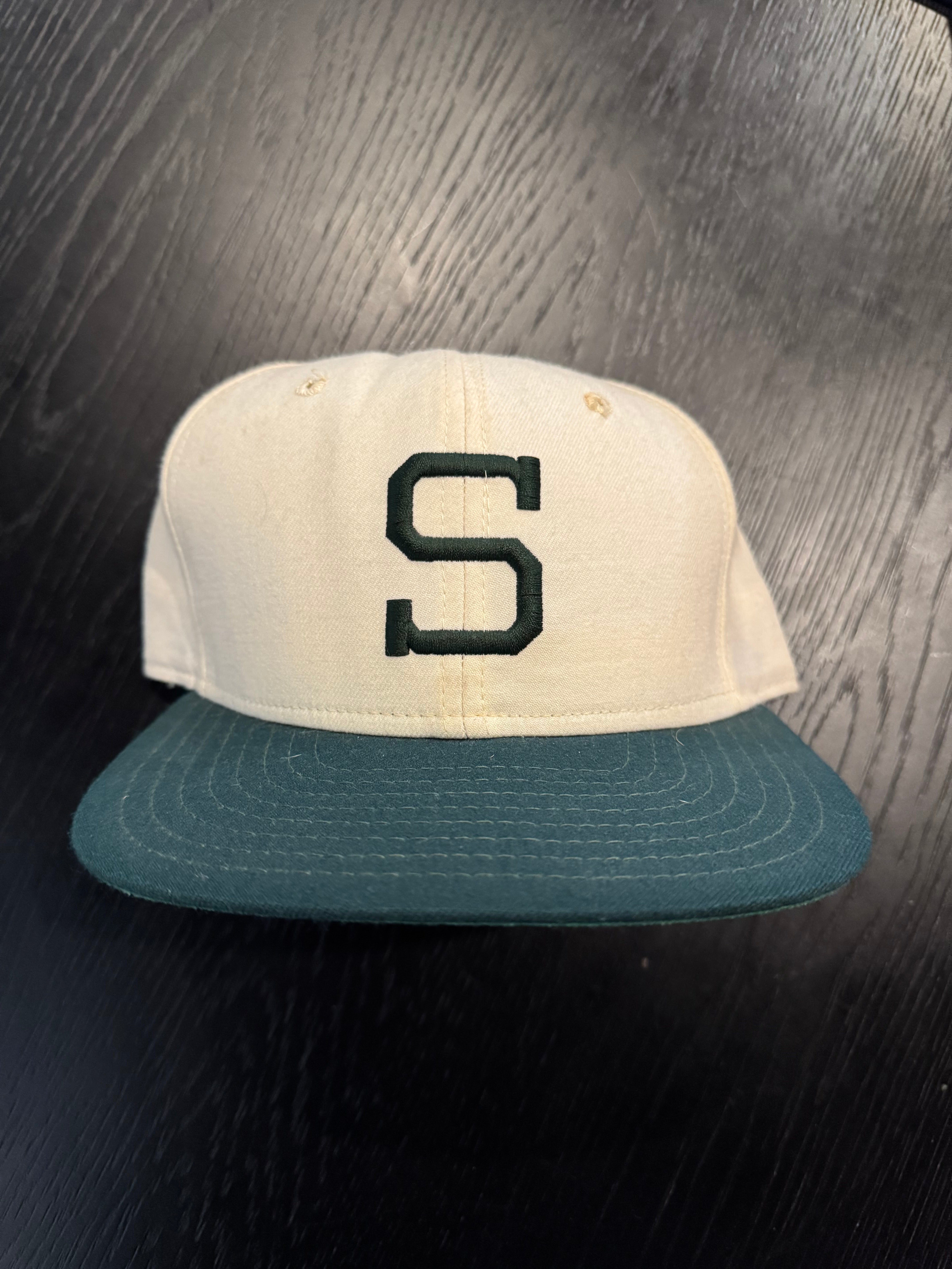 Bring the varsity vibes with this vintage fitted cap featuring a bold forest green “S” on an off-white wool crown. With a green flat brim and classic green undervisor, this fitted cap embodies timeless college style. Perfect for Michigan State fans or anyone who appreciates clean, retro design.